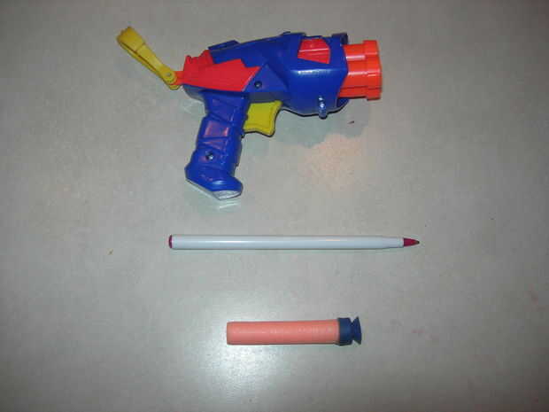 Primero necesita una pistola de nerf de cualquier tipo, luego necesitas una bala de nerf y una pluma, entonces necesita un par de tijeras y airsoft balas. necesita tirar de los extremos de la pluma y la punta de la bala de nerf. Ahora tienes que y pu