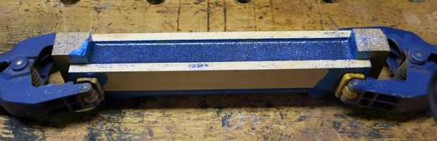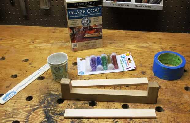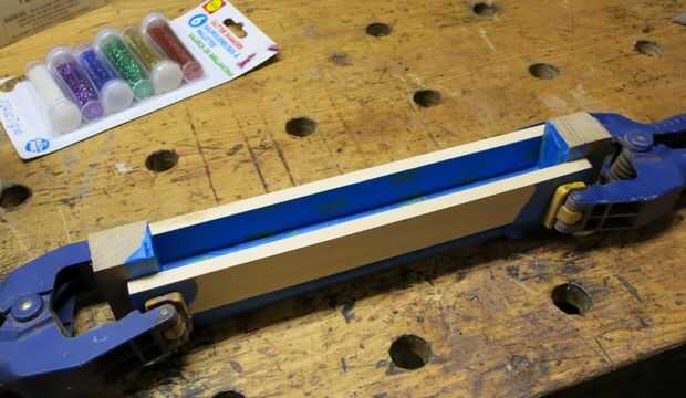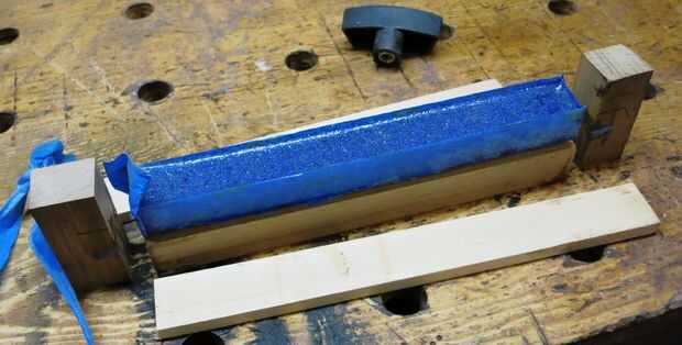 Utilizar algunos restos de madera para construir un canal para mantener la mezcla. Fui con 1 x 1 x 7". Cubrir los lados con cinta de enmascarar para mantener el epoxy de fijación a la madera. Sujeta los lados con las abrazaderas de muelle.