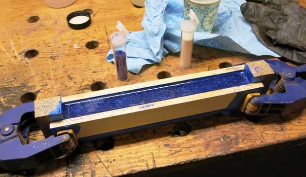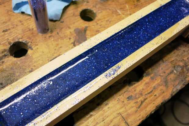 Mezclar el epoxi en una proporción 1:1, agitar durante ~ 6 minutos y empezar a verter en el canal. Continuamente añadir brillo o la decoración de su elección y seguir mezclando. Estaba probablemente en una proporción de 4:1 del azul al blanco brillo. Una vez que tienes el canal completo y han vertido suficiente materia particulada, coloque a un lado seco durante al menos 72 horas o no según las instrucciones.