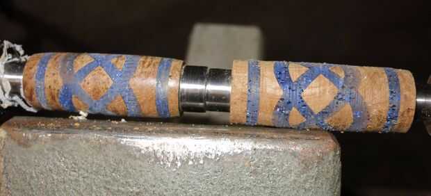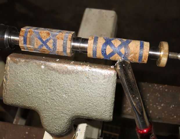 Recortar las esquinas afiladas del espacio en blanco si quieres antes de empezar a dar vuelta. He encontrado ayuda con salidas de la rotura pero no es necesario. Empezar a frenar con una gubia y gire todo el en blanco a un cilindro. Cabe destacar que en esta etapa, la gubia de la viruta y hoyo el epoxi... esto es normal, no ir demasiado profundo. Siga con un sesgo o raspador para quitar estas y cualquier otras rayas.
