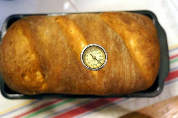 Después de que la masa ha aumentado en el segundo tiempo apagar el horno a 350-375 grados F y hornear durante unos 30 - 45 minutos. Utilicé un termómetro de sonda y retirar el pan cuando el interior alcanza temperatura de 200 grados F.