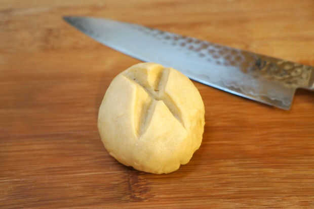 Usando un cuchillo afilado o un par de tijeras hacen sus diseños en la masa de pan.