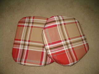 Primero, la tela. He cubierto los cojines y grapados con una pistola de grapas. No hay necesidad de ser perfecto. (Elija a una tela bonita que hice. Ya actualicé a algo mucho más lindo.)