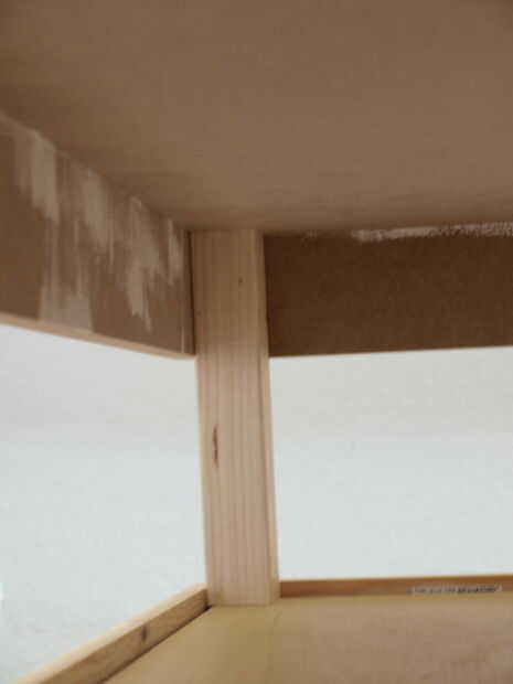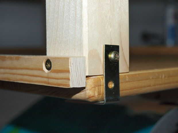 Ahora ponemos los dos paneles laterales con los pies en cada lado del panel grande y taladro con una broca de 3 mm a través de los agujeros en las patas. Entonces nos Atornille los tornillos de madera de 5 x 80 mm a través del panel grande en las piernas.