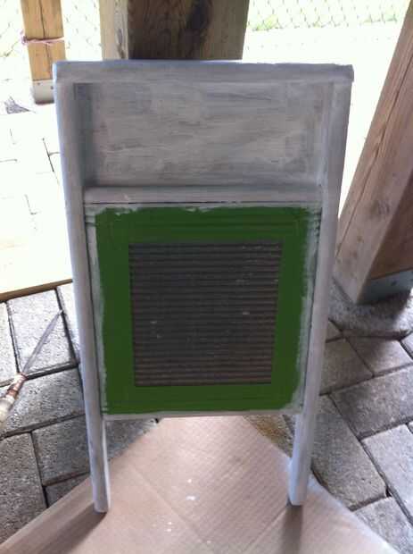 Simplemente rozó en una sola capa fina de color blanco sobre la madera original de la tabla de lavar. Realmente no necesita para que sea perfecto o incluso una sólida capa de pintura, como la idea es hacer que la pintura parezca antiguo. Después pintando, he quitado la cinta adhesiva y deje que se seque durante la noche.