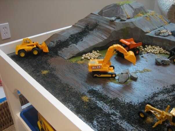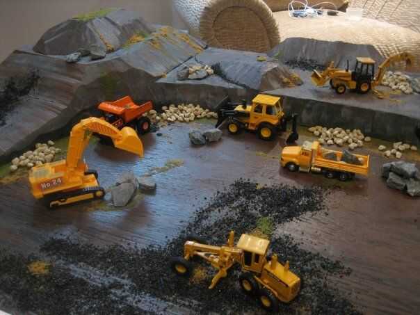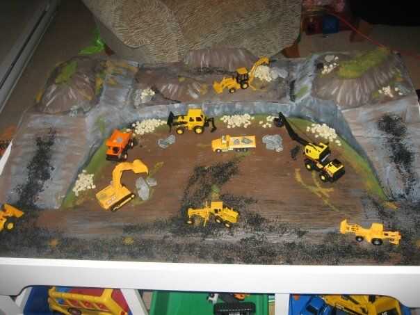 Después de algún sellador acrílico y frocking, algunas rocas y camiones de juguete están listos para ir. Le doy una semana antes de sea destruido.