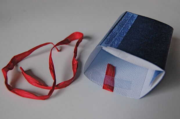 Cinta adhesiva un trozo pequeño de cinta a través de lo que será la parte superior del regalo (el rectángulo frente al bolsillo de la tarjeta de regalo), como se muestra en la primera imagen a continuación.