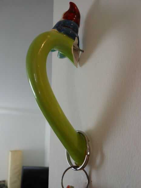 tuve la suerte suficiente saber que el mango de mi taza más prised era en realidad hueco. Separó cuidadosamente los pedacitos de cerámica que rodeaba el mango con un martillo que dejó una pequeña cresta en la parte inferior, ideal para colgar de un llavero en sin que caiga. He golpeado un clavo en la pared y había equilibrada la parte superior de la manija sobre la misma. Con el peso de las llaves que cuelgan hacia abajo desde el parte inferior el punto dio suficiente fuerza en el centro de gravedad equilibrio perfectamente y sobresalga a un ángulo de 90 grados de la pared. Es una característica interesante y algo para que los huéspedes puzzle sobre al menos un buen 10 minutos antes que averiguar qué es y cómo funciona.