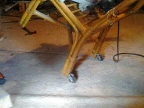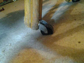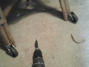 Hacer la Sierra portátil requiere rodillos de montaje para las patas traseras. (como se muestra en el cuadro #1) Que necesitan para montarse así cuando la silla se inclina hacia atrás las ruedas pueden ser utilizadas para mover la sierra fácilmente. Taladré un agujero en las patas traseras lo suficientemente altos como para que los rodillos no tocan el suelo hasta que la silla se inclina hacia atrás. (como se muestra en la figura #2) Con estos rodillos particular tenía que perforar un pequeño agujero e Inserte un tornillo (como se muestra en el cuadro #3) para que el rodillo se mueva. Ahora cuando la silla se inclina hacia atrás, (como se muestra en el cuadro #4) el rodillo se utiliza ahora para mover la sierra a dondequiera que usted necesite.