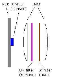 cortar dos cuadrados pequeños de la película expuesta en el mismo tamaño del filtro que sacó de su cam. Si sólo utiliza una capa de película luz visible será todavía recogido por cámaras en la mayoría. De ahora en adelante su wil cámara sólo mostrará imágenes en blanco y negro pero las imágenes son más agradables que sin la película expuesta.