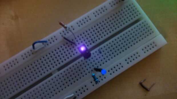 Cuando la luz infrarroja (de IR LED) reflejan una superficie (puerta del baño), el fototransistor deja la corriente de flujo, la entrada 5 del LM324 es + IRV y compara el voltaje de la entrada 6 (puente divisor de tensión), si el valor es mayor, la salida 7 dan 3.5V (5V - 1, 5V).