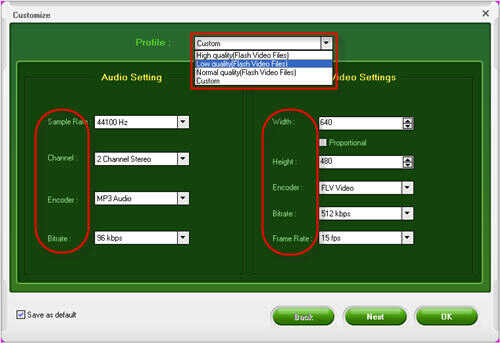 Éxito botón "Personalizar", en el paso 1 de personalizar ventana, toma audio y ajustes de vídeo. Tasa de fotogramas de vídeo y velocidad de bits, mejor calidad de vídeo flash de salida.