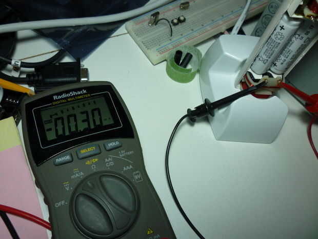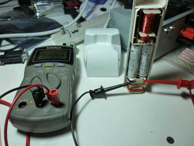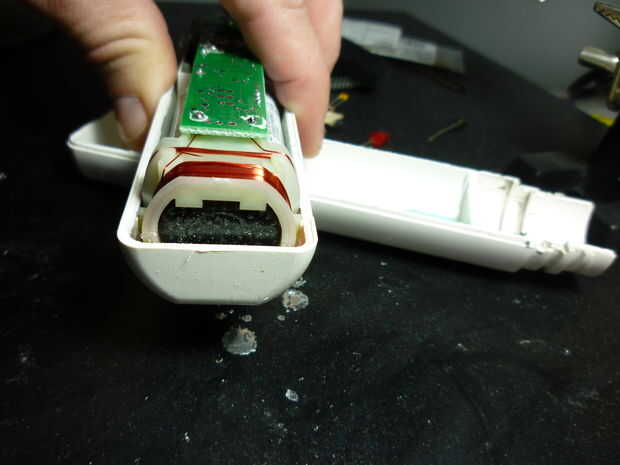Este mango de cepillo de dientes particular es totalmente sellada, uso de bobinas magnéticas para cargar las baterías y mover la cabeza de cepillo de dientes. La bobina en la parte inferior se utiliza para cargar las baterías, y hay una bobina similar en la estación base del cargador. Retirar la placa de circuito nos permite hacer algunos experimentos en la bobina. Si medimos la corriente por la bobina cuando no está en la estación base, no vemos naturalmente ninguna corriente. Cuando coloca en la estación base de carga, mi multímetro mostró alrededor de 30 mA. Probablemente sería más útil medir utilizando un osciloscopio, ya que es probablemente una señal de AC. Podría hacerlo algún día. Muy interesantes!