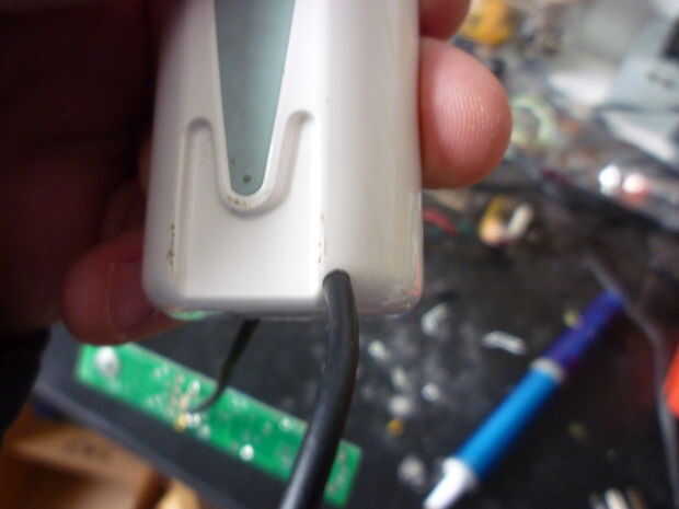 A continuación, perforé un agujero pequeño en la parte inferior de la caja, sólo lo suficientemente grande como para que el cable caber a través. He pelado los extremos del cable y soldar los cables en la placa de circuito donde las baterías se utilización para conectarse. Asegúrese de poner el cable a través de la caja antes de soldar sus cables a la placa de circuito!