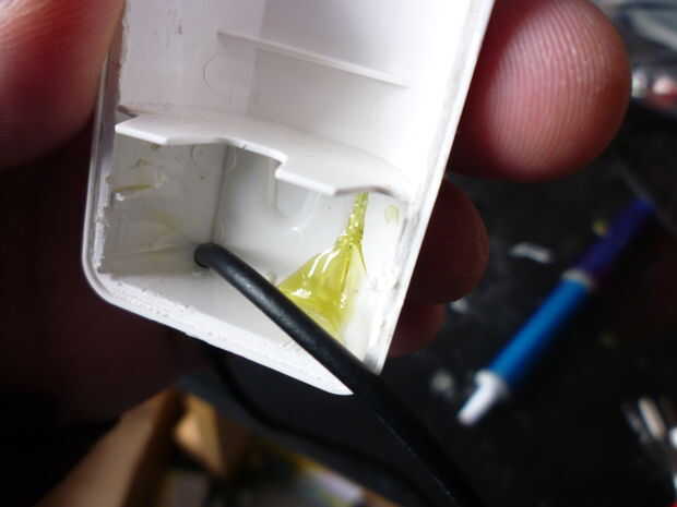 Usé un destornillador ranurado para cuidadosamente sacar la bobina inferior (carga) y las dos baterías, por lo que habría espacio para mí hacer un agujero para el cable de alimentación. Trate de no romper el gabinete exterior mientras alzaprimar hacia fuera estas piezas!