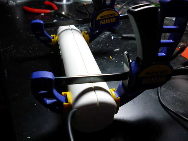 El original impermeabilizante sobre el mango del cepillo era muy agradable, como pude dejar sentarse por el lavabo del baño y deje pasta gotear sobre ella, todo sin tener que preocuparse por romper cualquier cosa dentro. Yo quería hacer como impermeable posible fácilmente, por lo que aplicar pegamento a lo largo de la zona de contacto entre las dos piezas de la caja. Miró para asegurarse de que podía ver un poco de pegamento que exuda hacia fuera todo el camino alrededor del borde. Usé un par de pinzas de madera para aplicar presión sobre el caso durante la noche. Al día siguiente, era incapaz de separar el caso con mis manos, y estoy seguro de que es resistente al agua.