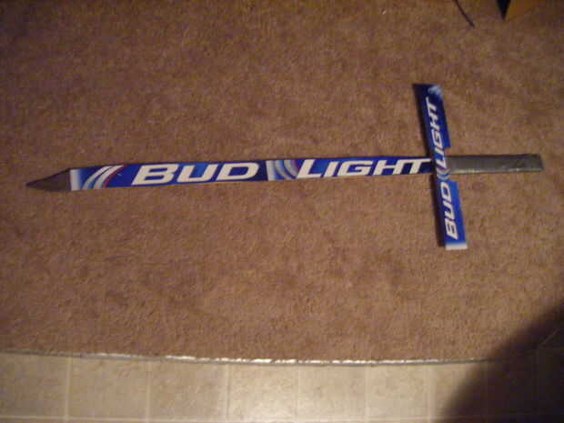 Ahora corte una franja que incluye el logo de "Bud Light" que atraviesa el mango. Atención: esta parte es doble cara y tijeras la mayoría tienen algunos problemas para conseguir a través de este. Asegúrese de que cortar lo más cerca del punto de pivote de las tijeras como sea posible. Ahora pegue tira en el travesaño.