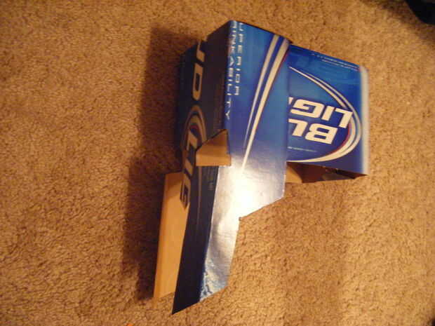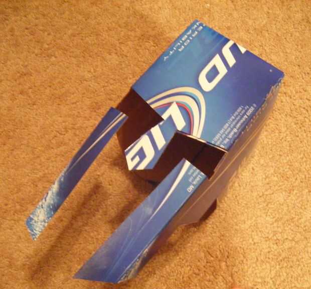 Ahora ponemos la pieza frontal de la cabeza pieza como se muestra y cinta o pegamento las pestañas de abajo. Asegúrese de que dejar la pestaña superior para el final. Puede Agregar cinta a los lados para hacer la pieza de la cara más rígida.