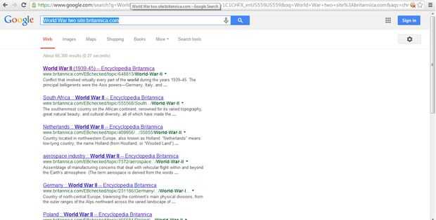 al final de mi búsqueda. También la usé para buscar específicamente en un determinado sitio por poner el nombre del sitio el sitio: etiqueta. Por ejemplo, para asegurarse de que sólo busca segunda guerra mundial en el sitio web de la Enciclopedia Britannica, prueba esto: