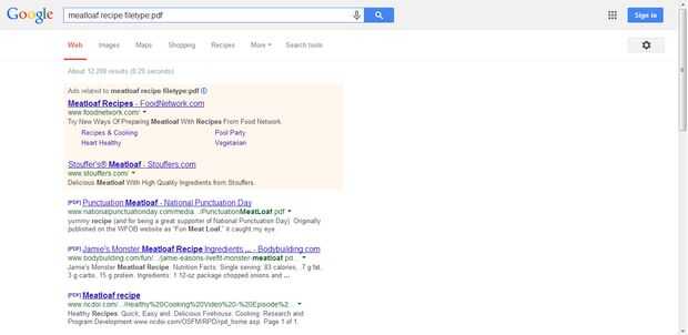 me parece que a veces solo necesito un archivo de un tipo determinado. Para ello, utilice la etiqueta de tipo de archivo. Por ejemplo, para asegurarse de que sólo tengo el PDF de recetas de pastel de carne, usada filetype:pdf después de mi búsqueda. Esto da como resultado esto: