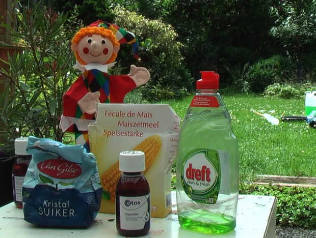 La parte principal de la mezcla de jabón es agua. Agua adecuado es muy importante. El agua destilada es la mejor. Agua del grifo en muchos lugares es usable. No utiliza agua dura. Puede explotar agua blanda de un aparato de aire acondicionado. Agua de lluvia filtrada también es utilizable. Utilice un filtro de café para obtener las partículas de polvo hacia fuera. Usted puede probar el agua del grifo haciendo jabón de burbujas con agua destilada y agua del grifo y comparar los resultados.