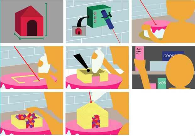 Así que, he decidido que la máquina que sería construir no era algo que iba a hacer el montaje de objetos en 3D algo, pero en su lugar, le guía a un fabricante a través de los pasos de la construcción de un objeto sólo como una impresora 3D. Lo que estoy construyendo es una guía de láser. Dibuja un punto sobre una superficie y la máquina sigue el punto, extrusión de materiales como van. Mi primer guión de esta interacción (mostrada arriba) esta considerado como una nueva manera de decorar tortas. Subir un modelo 3D para la guía y la guía convierte a G-Code. G-Code es el lenguaje que hablan de impresoras 3D. Cada línea de código de G le dice una impresora 3D para hacer algo (girar a la extrusora de apagado/encendido, hacia un punto, etc.). Estas instrucciones son entonces comunicadas a mi guía láser y dibujadas por el creador. Por ejemplo, si dice que el G-code a moverse en línea recta del punto al B, mi guía láser dibuja un punto de la A la B y la máquina lo sigue con la mano. En algún momento, el modelo puede ser que necesite ayuda, y cuando estamos usando materiales cotidianos, podemos identificar rápidamente los materiales para soportar nuestro modelo, en el ejemplo anterior, que muestro cómo alguien podría utilizar cereales como andamio para la decoración de una torta.