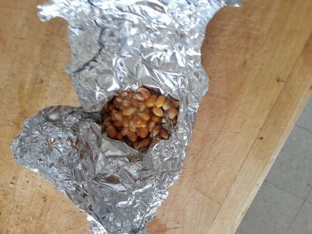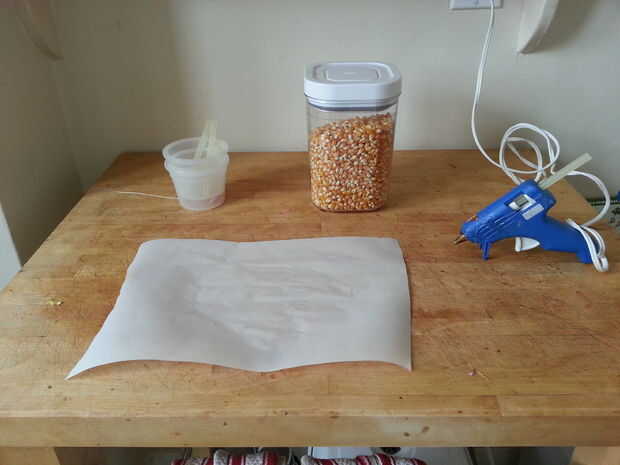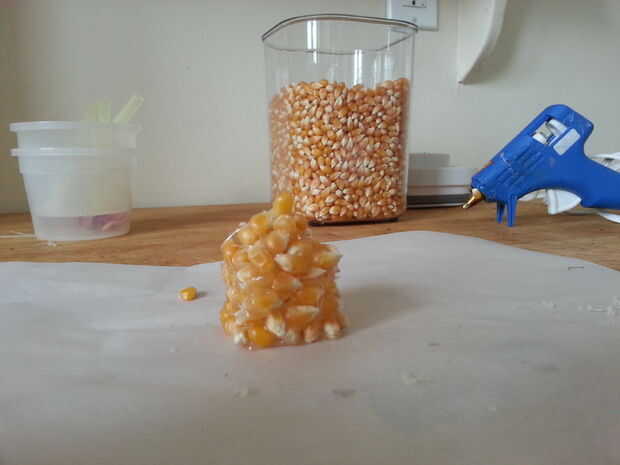 Repetí el proceso con palomitas de maíz. Pensé que sería genial crear algo 3D fuera de los núcleos y luego reventarlas para ver lo que surgieron nuevas formas. Como era de esperar, el punto de fusión para una pistola de pegamento es menor que la temperatura del estallido de las palomitas de maíz y terminé con un montón fundido de granos de cola. Voy a repetir algo más calor tolerante y presentará un informe pronto. También pensé que sería genial fabricar desde los partidos y luego encender fuego el lechón!