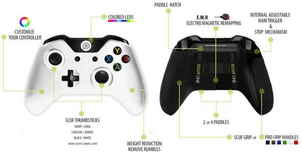Es un controlador de Scuf como un controlador regular pero los principales cambios que se es que tienes dos botones en el lado izquierdo y derecho del control. Estas características le permiten saltar y agacharse sin tener que mover los dedos del palillo análogo a los botones ABXY que tienen controladores de Xbox. Casi cada jugador que compite en eventos profesionales tienen un controlador Scuf. No sólo te da una gran ventaja, también es cómodo porque vienen equipadas con empuñaduras en el controlador para que las manos sudorosas no harán la hoja de control.