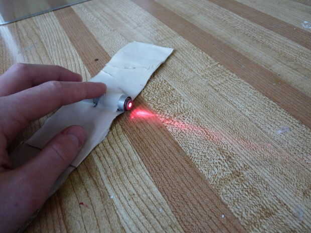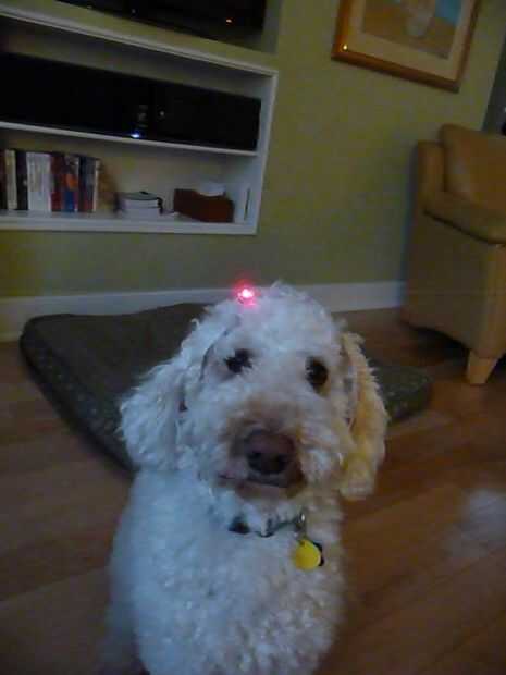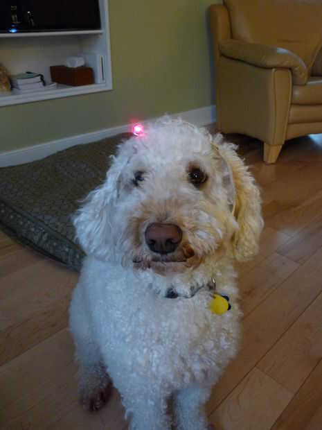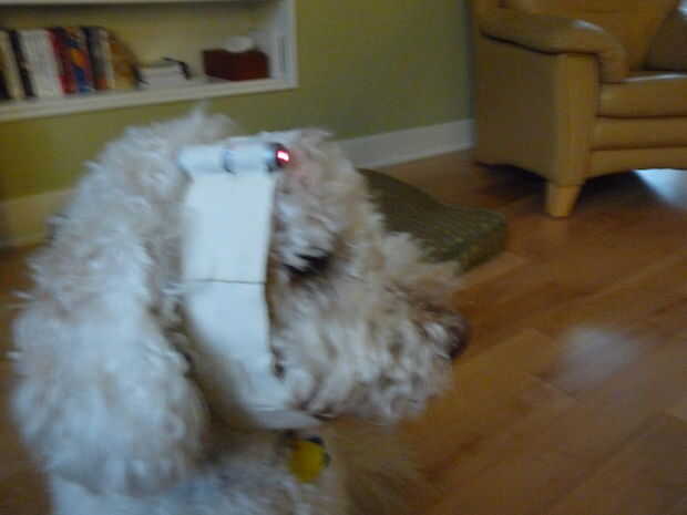 Hey Instructables! Mi perro, Coco, ama persiguiendo los lasers, y ahora puede tener siempre una a perseguir! Montara este láser en dos trozos de cinta de hockey que estaban pegadas. El botón es presionado por un trozo de cinta. Dondequiera que mira, el laser sigue! Él también se ve un poco como un robot! Es un poco weirded hacia fuera por la correa alrededor de su cabeza, pero él perseguirá durante cortos períodos de tiempo. Creo que esto debería funcionar mejor en un gato, ya que ellos parecen disfrutar persiguiendo láseres más, al menos de mis experiencias. También podría funcionar mejor si el láser se monta en el cuello de los animales, para que no se les molesta. Si te gusta la idea, por favor, vote por mí en el Wicked Lasers! ¡ Gracias!