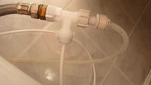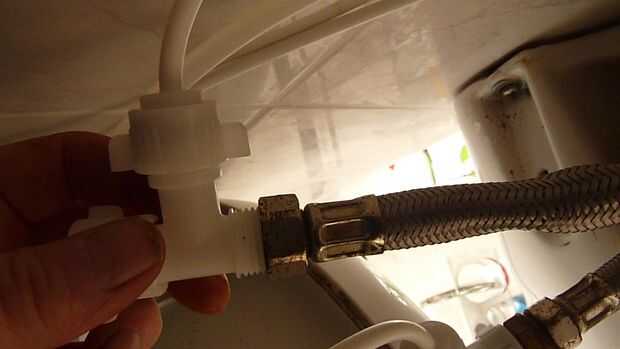 Conecte la manguera flexible al conector T y apriete con una llave inglesa o alicates de la bomba de agua, teniendo cuidado de no sobre apretar los hilos de nylon. Conectar el tubo de pequeño calibre con las manos firmemente y colocar en la parte inferior de la grifería del baño.