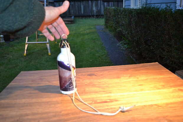 Pase el bucle a través del agujero en la tapa y pase a figura 8 nudo bucle. Tire el nudo para fijar el cable a la botella. Siento ser tan aburrido. Por favor piense en sonrisa y divertido chiste. Sé que está esperando el movimiento lento.