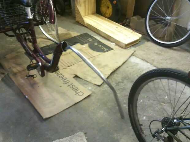 he decidido volver a utilizar el asa para la varilla de conexión entre los dos. Curvado hacia arriba y sobre mi rueda trasera de mi bicicleta y alineado con la barra de asiento perfectamente.