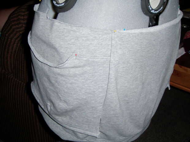 Los bolsillos se colocarán en los paneles enfrentados de la falda. Los pin y pasar unos hilvanes (una puntada larga usada para sujetar cosas en su lugar mientras se está construyendo la prenda) la falda detrás Junta. No te preocupes ajuste en este paso, será ajustado a continuación.