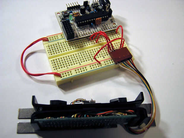 Como se puede ver a continuación, un encabezado macho ángulo recto conectado a un tablero de pan y mi lector a. Conecté mini-alarma a PIND2 (pin digital 2 en un Arduino), /CARD_PRESENT PIND3 (para fines de ilustración), y /DATA1 a PIND4. Asegúrese de que activa pullups en estos pines para no flotan sus pernos. Yo también cotizan a mi Arduino de un AVR desnudo huesos porque me gusta la manera que calce sobre el protoboard.