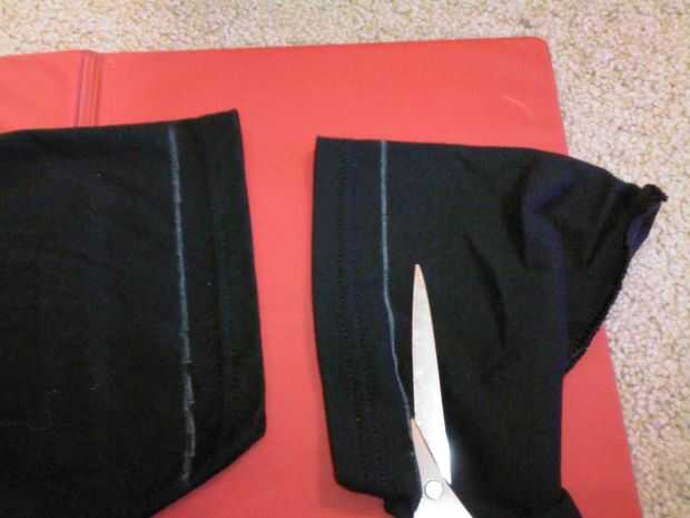 #2, medida de 3/4 de pulgada por encima de los dobladillos. Marque la línea con crayón o tiza. Corte estas bandas. Coloque las bandas sobre los dobladillos de manga de su vestido. Doblar el borde hacia el interior de las mangas. Coser las bandas en las mangas.