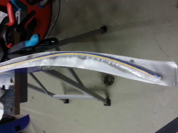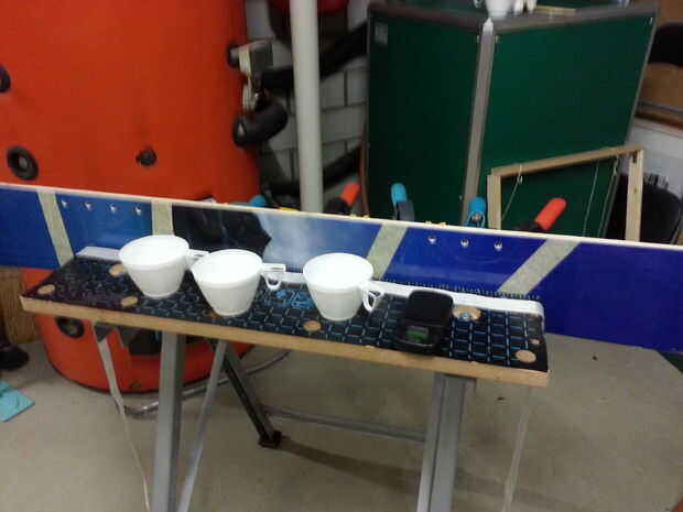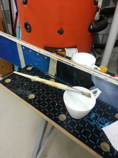 Ahora es el momento para cubrir los lados con la cinta de fibra de vidrio. Creo que sólo podría usar algún pegamento y "pintar" sobre, pero quería algo un poco más duradera. Además, quería probar cómo trabajar con él, como nunca lo he usado antes. Coloqué la cinta tejida a lo largo del borde de la tabla, había fijada con abrazaderas y mezclar el epoxi. Luego empecé a empapar la cinta de fibra de vidrio epoxi con un pincel. Esperé hasta que todo estaba seco otra vez y simplemente cortar el resto superpuesto con las tijeras.