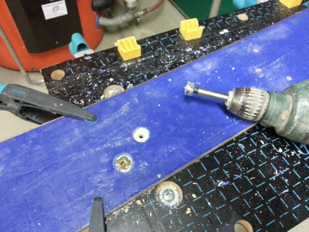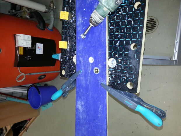 exacto en este paso. Es esencial para el resultado de su proyecto. Creo que me precipité un poco demasiado allí y al final tuve que lidiar con algunos problemas que vinieron con eso - encajaba perfectamente. Pondré un extracto de las instrucciones aquí cuando encuentro el tiempo. Básicamente, pegar la plantilla de la hoja adhesiva sobre la tabla, marcar los puntos que están en la plantilla con un punzón y luego perforar los agujeros. Luego, usted Avellane los orificios desde el otro lado de la Junta. Atención: hacerlo poco a poco! Presiona demasiado al avellanado y el taladro salió bien a través de la Junta! Tuve que llenarlo con la mezcla de epoxy/del serrín nuevamente y repita todos los pasos. Por desgracia, no tengo muchas fotos de este paso.