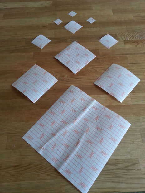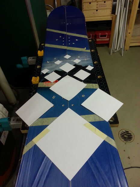 Lijar la capa superior de mi tablero abajo, primero a mano, luego con la máquina y luego a mano otra vez, hasta que tuviera una superficie lisa. Mientras tanto, corté el patrón. Esto fue muy fácil, porque el papel ya tenía plazas en él, sólo tuve que seguir las líneas. Entonces poner las piezas de papel de aluminio en el tablero, para ver donde todo irían y hacen notas sobre las posiciones.