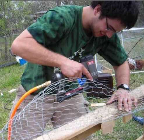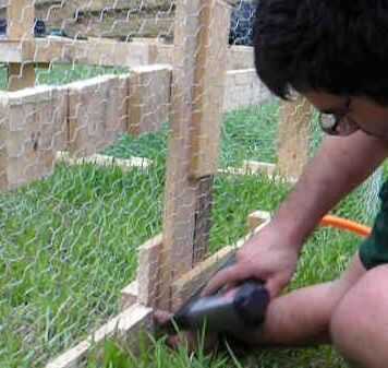 -La tensión más pones en el cable, mientras grapado, el mejor se verá la coop. Crear tensión tirando lejos de la zona que gustaría hacer tenso: si estoy clavando la esquina superior derecha de una ractangle de alambre de pollo, estoy tirando para arriba y a la derecha mientras que la grapa.