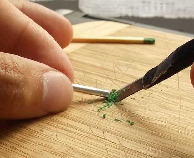Utilizar su cuchillo para raspar la capa de la cabeza de un partido. Con cuidado, ponlo dentro del cuerpo del cohete. Se trata de nuestro combustible. Puede utilizar a fósforo para compacto combustible dentro. Alternativamente, en vez de rascar, puede cortar cabeza de fósforo entero y ponerlo dentro. Ambos métodos son aceptables.