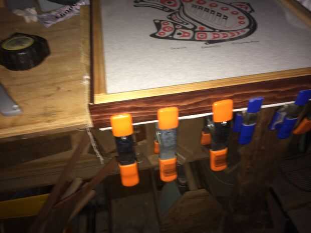Mi visión original para este proyecto fue un marco de listones de pino para los bordes. El ribete ancho listón fue a servir a un propósito dual, como el pegamento debe filtrarse a través de la tela y todo el asunto a la Junta de cemento. Me había teñido previamente el listón con un caoba oscuro y luego lo tiro con un poliuretano para dar un bonito contraste a la camiseta.