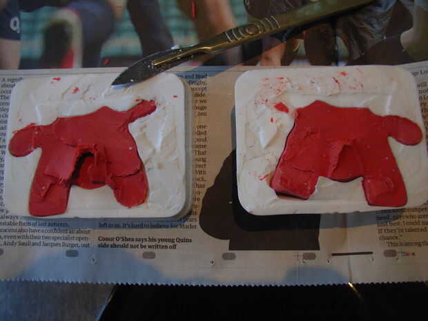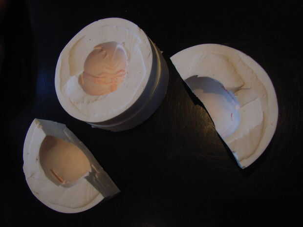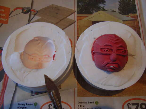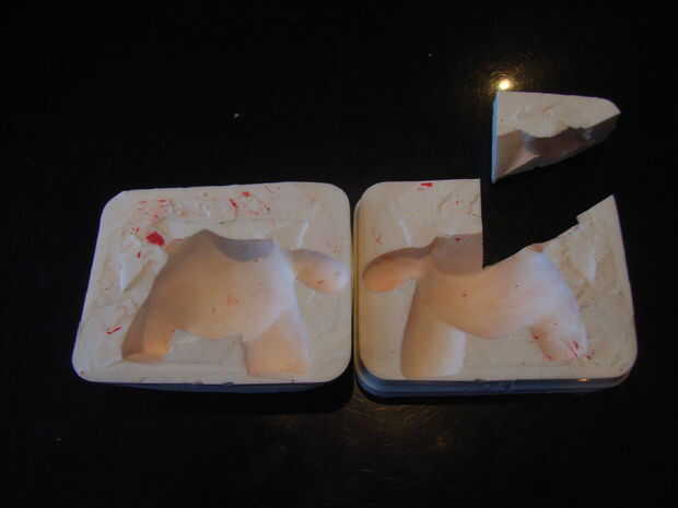 Los dos modelos habían quedados en el látex hasta que totalmente establecido para producir dos bloques de molde sólido, cada uno con un modelo totalmente cerrado. Los moldes entonces ser más adelante aparte cortados cuidadosamente con un escalpelo para crear las secciones separadas del molde. El látex fue dejado por más de una semana para asegurarse estaba bien antes de cortar. Si la corte cuando no totalmente curado, puede ser ligeramente suaves o desmenuzables, que ruinas el proceso. Se necesita un buen corte a través de una bien ajustado de látex.