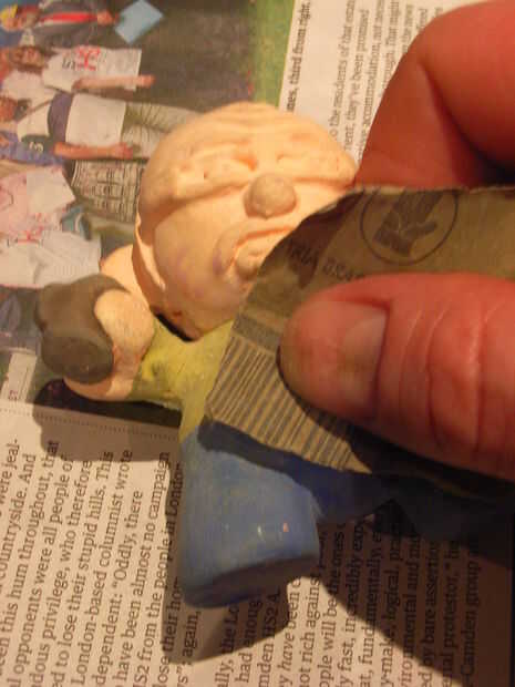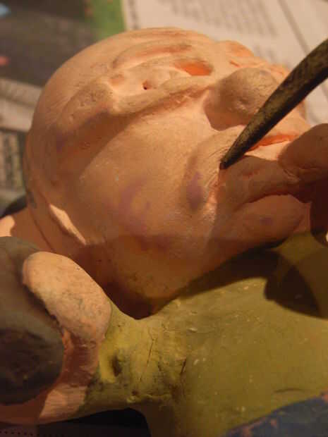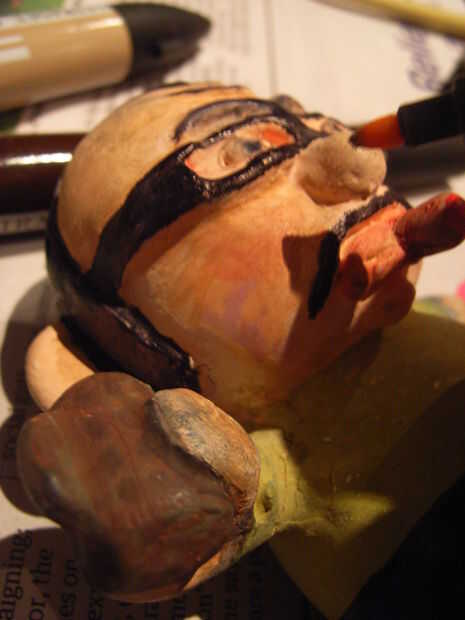 La pintura tiende a actuar como un relleno, cubriendo imperfecciones como las huellas digitales, el modelo original o pequeños agujeros y depresiones del molde. Sin embargo, también tendía a disminuir los detalles donde se ejecuta y piscinas en ellos al líquido. Después de capas, el modelo se mantuvo sostenido por corte y la presentación en la pintura en estos detalles, como la boca y ojos, usando pequeño divisor archivos.