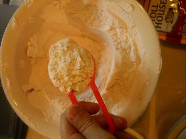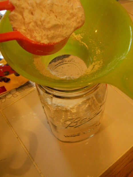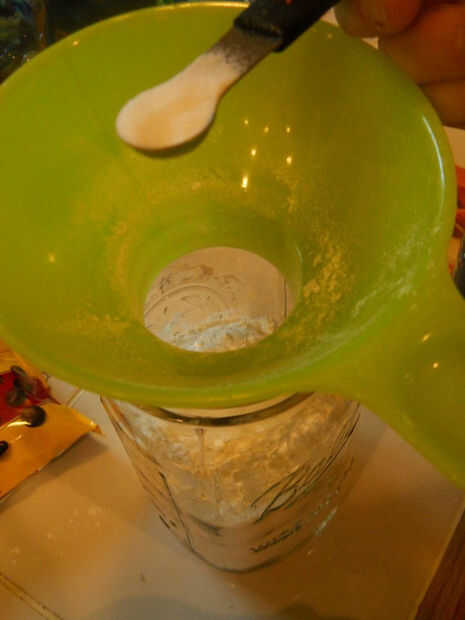 Primero mezclar la harina, el bicarbonato de sodio y la sal en un tazón pequeño. Luego verter en un tarro de cuarto de galón. Estoy usando un embudo, porque de lo contrario sería por todo el lugar.