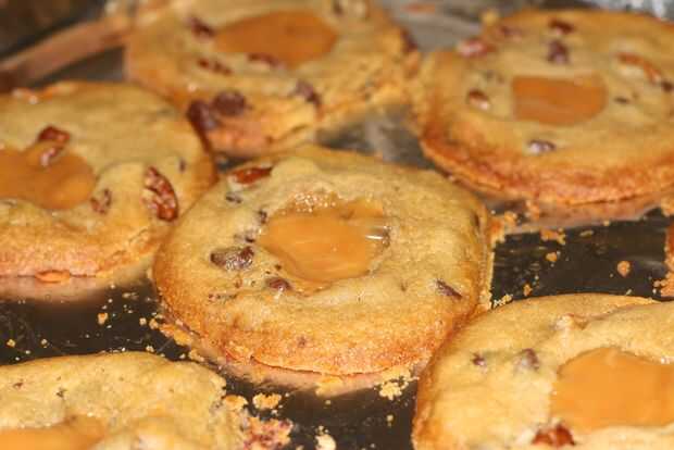 Hola!Aquí una receta de galletas masticables al siguiente nivel!También se puede encontrar el post todo sobre esto en mi blog.Caramelo Chocolate Chunk Cookies{receta de no sin sal}Hace 32 galletas grandesmantequilla de la taza del 1/2 {1 palillo}1 1/