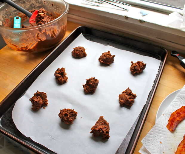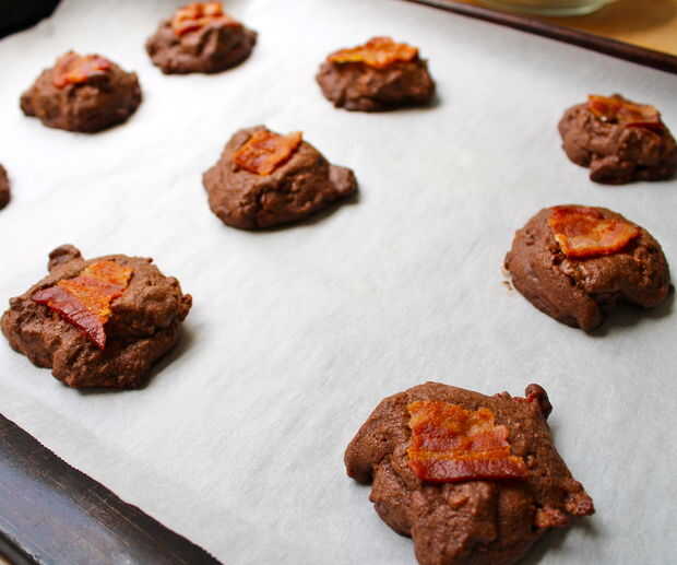 Hornee a 350 F durante 12 minutos. En cuanto salen las cookies, presione un poco de tocino en la parte superior de cada galleta.