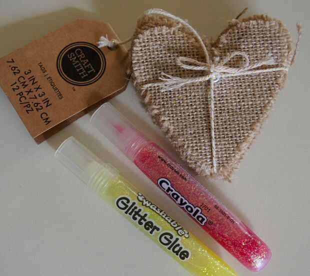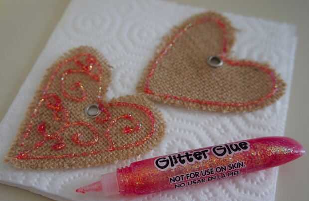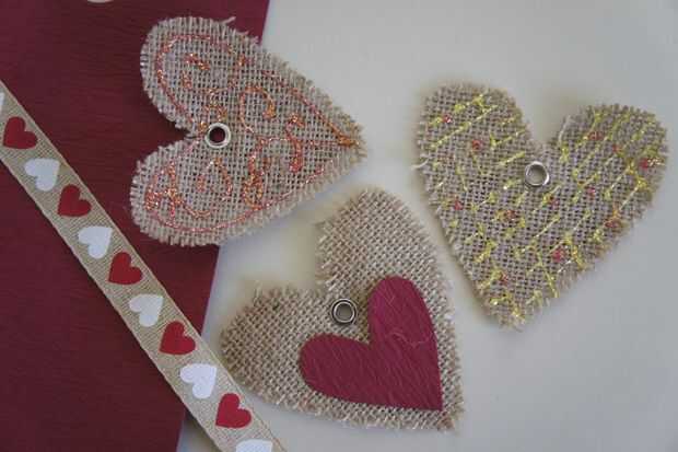 Mientras que las galletas son de enfriamiento, diviértete decorando y embelleciendo las etiquetas. Hice las etiquetas por los cortando corazones de papel rojo y pegar los corazones de arpillera. Es perfecto para personalizándolos y escribir un mensaje de día de San Valentín.