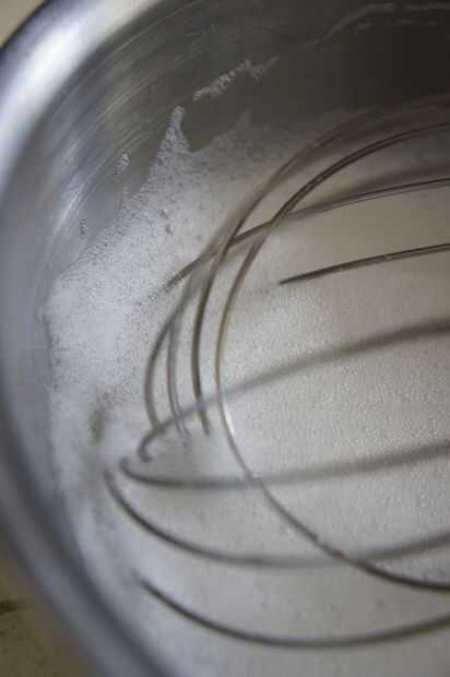 Combine las claras de huevo y la sal en un tazón pequeño y usando un batidor, batir la mezcla hasta que se formen picos suaves. Lentamente añada el azúcar en polvo y continuar a batir hasta que la mezcla esté dura.