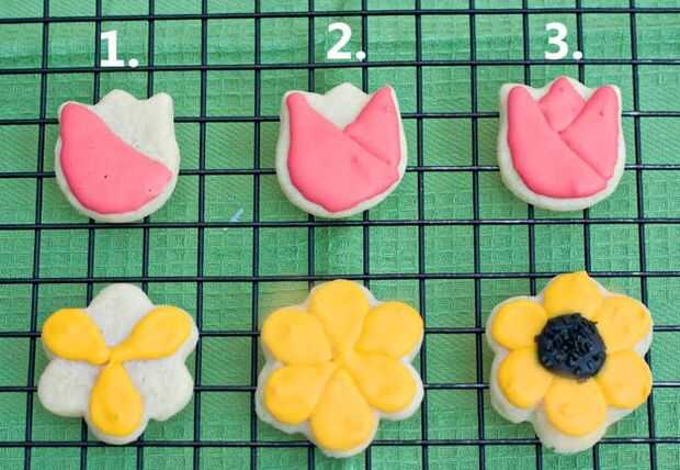 -Estirar la masa y cortar flores, colocarlas cerca de 1 pulgada aparte en una bandeja para hornear galletas. Coloque un palo de piruleta en cada galleta con un trozo de masa para galletas.
