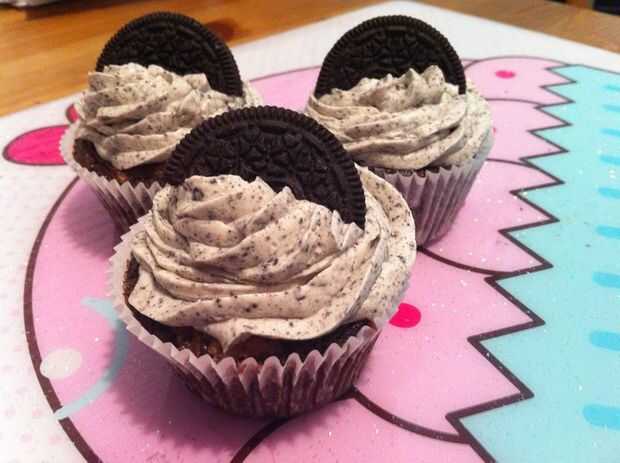 Línea de latas cupcake con papeles y colocar una galleta oreo en la parte inferior de cada lata. Llenar 3/4 vías con masa de pastel de chocolate (cualquier chocolate caja mezcla funciona perfectamente o me encanta la receta de pastel de Chocolate perfectamente de Hershey). Las galletas flotarán en la parte superior. Hornee según caja o receta, normalmente alrededor de 15-18 minutos. Una vez enfriado, hielo con receta a continuación:
